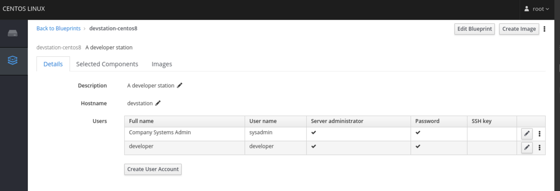 I would also suggest adding some users and all the packages you want to install from the user interface. In our case, we are going to create the following users by clicking on the details tab of the new blueprint. In both cases, the password is known by the respective group of users and also belongs to the wheel group.